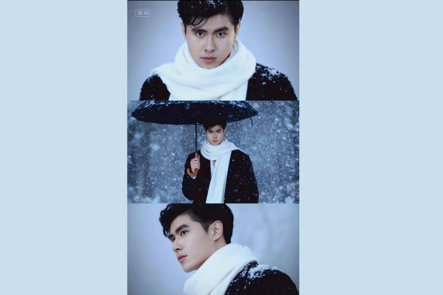 Chàng trai chill giữa rừng tuyết: Khoác áo dày, đứng giữa nền tuyết trắng cùng ánh sáng lam mờ. Biểu cảm lạnh lùng, góc chụp xa vừa tạo cảm giác cô đơn, vừa thể hiện sự cuốn hút tự nhiên.
