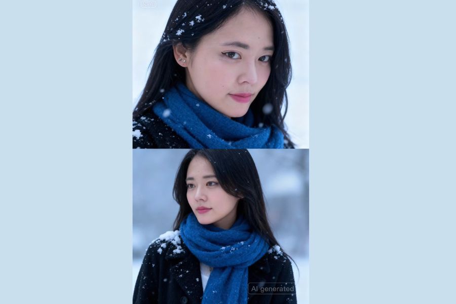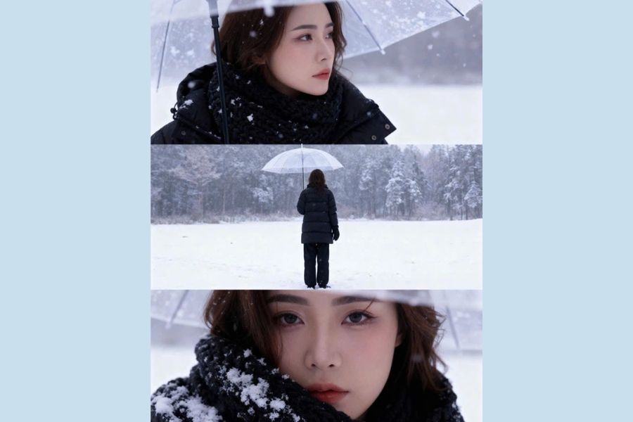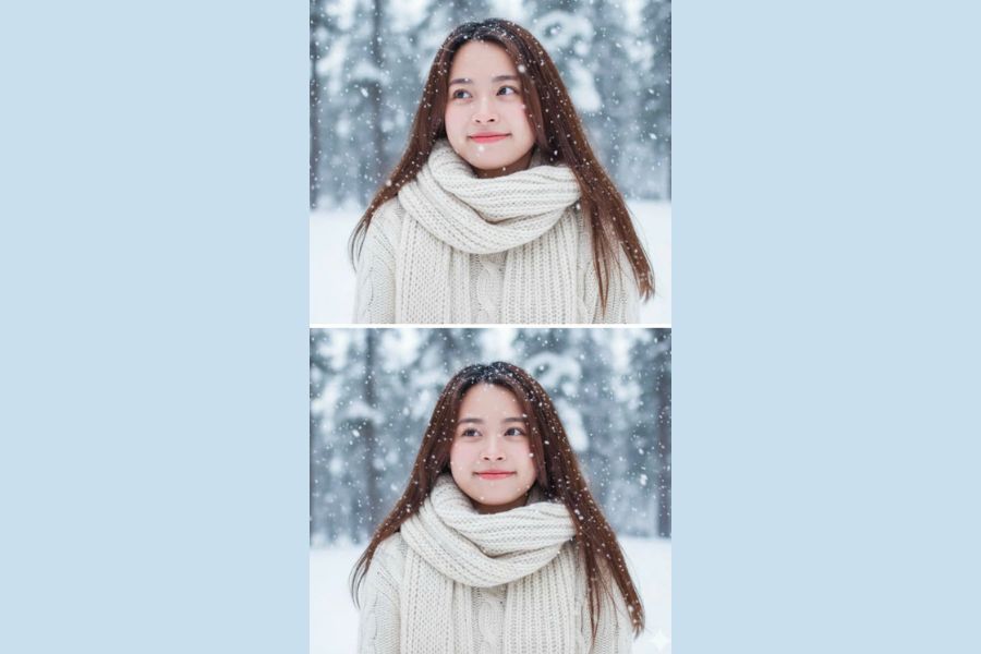 Kết quả ấn tượng hiệu ứng chân thực đến khó tin: Điều khiến trend này bùng nổ chính là sự chân thật đến khó tin mà AI mang lại. Hiệu ứng tuyết rơi mịn như thật, ánh sáng phản chiếu nhẹ nhàng trên gương mặt, bầu trời xám tro pha chút ánh vàng dịu tất cả hòa quyện tạo nên khung cảnh mùa đông đậm chất điện ảnh.