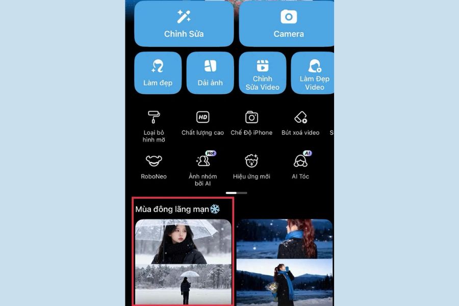 Tải hoặc mở ứng dụng Meitu trên điện thoại của bạn (có sẵn trên App Store và Google Play). Tại giao diện chính, chọn mục “Hiệu ứng mùa đông” (Winter Filter) đây là bộ lọc đang được yêu thích nhất nhờ khả năng tạo hiệu ứng tuyết rơi, ánh sáng dịu và tone màu lạnh rất chân thật.