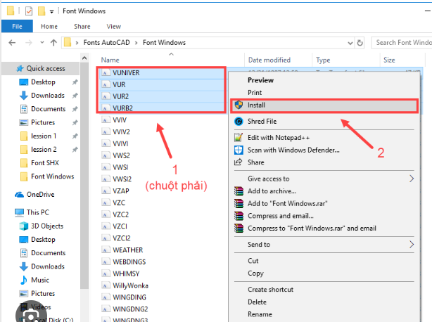 Chuột phải vào file .ttf → chọn Install hoặc Install for all users.