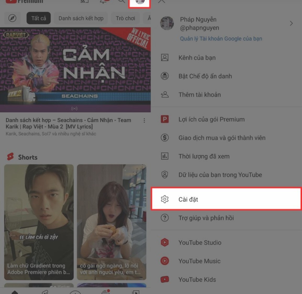 Bước 1: Mở ứng dụng YouTube trên điện thoại, nhấn vào biểu tượng ảnh đại diện ở góc trên bên phải và chọn mục Cài đặt.