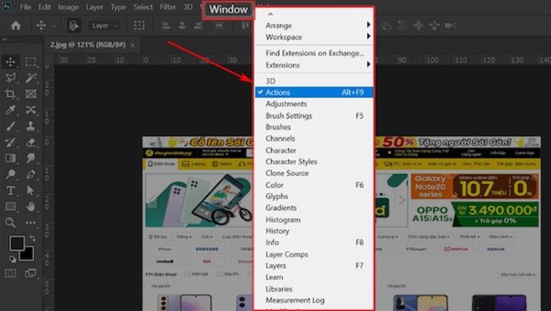 Mở bảng điều khiển Actions (Thường là Window > Actions).