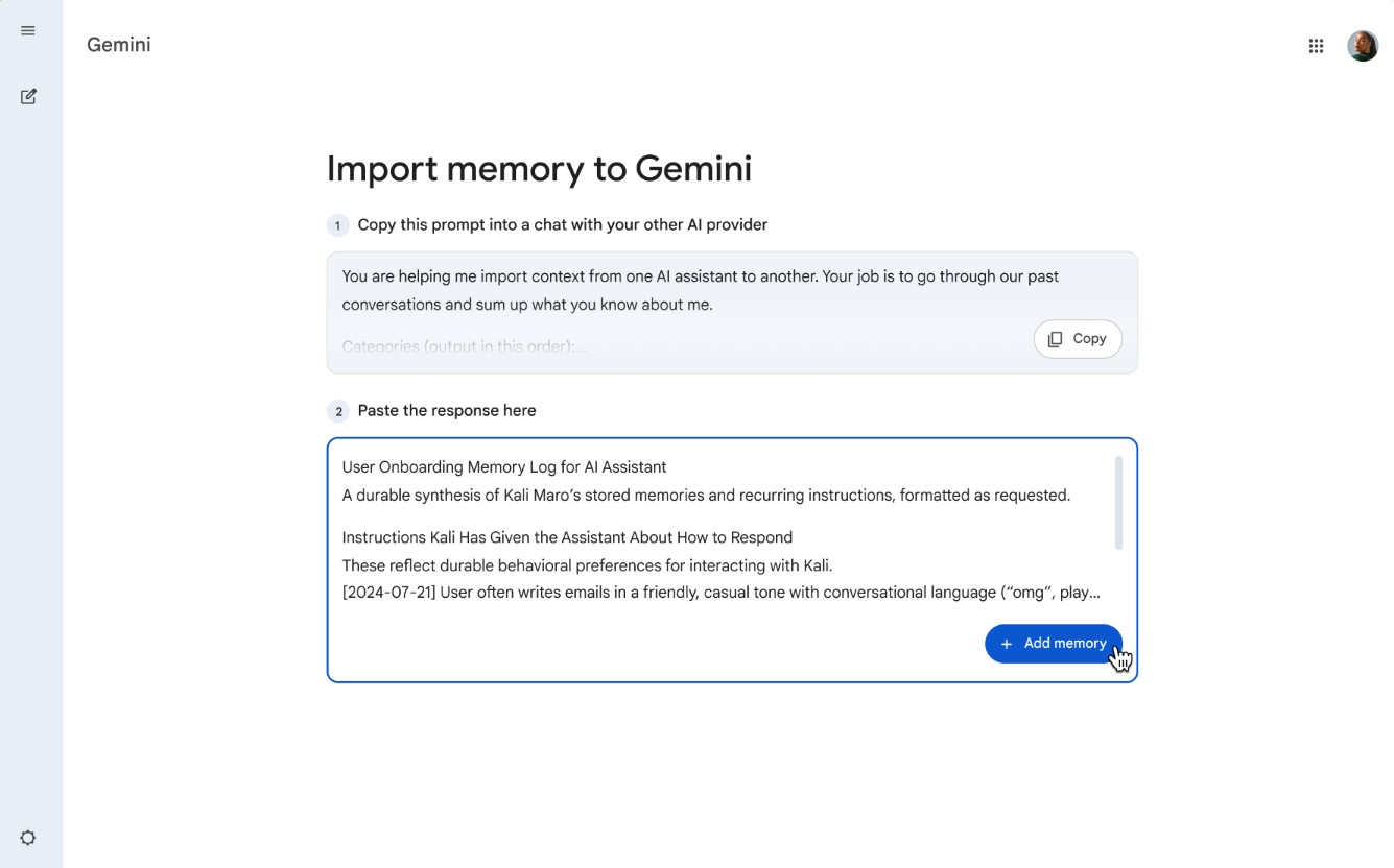 Sau khi có bản tóm tắt, người dùng đưa nội dung này vào Gemini, nơi nó được xử lý như một dạng “ngữ cảnh khởi tạo”. Từ đây, hệ thống có thể nhanh chóng hiểu được người dùng là ai, họ cần gì và cách họ muốn tương tác. Quá trình này giống như việc “chuyển giao kinh nghiệm” từ một trợ lý cũ sang một trợ lý mới, thay vì bắt đầu lại từ con số 0.