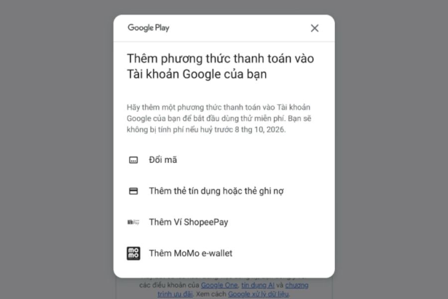 Bạn có thể thêm thẻ Visa, Mastercard hoặc ví điện tử như MoMo, ShopeePay, ZaloPay, tùy theo khu vực hỗ trợ. Mục đích của việc này là để Google xác thực người dùng thật và thiết lập sẵn cơ chế tự động gia hạn khi thời gian miễn phí kết thúc.