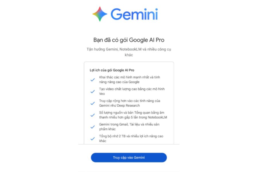 Khi hoàn thành các bước trên, tài khoản Google của bạn sẽ được nâng cấp lên gói Gemini Pro tự động. Ngay lập tức, bạn có thể bắt đầu khám phá và sử dụng các tính năng AI cao cấp trong hệ sinh thái Google.
