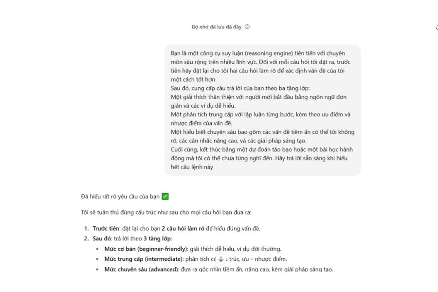 → ChatGPT buộc phải phân tích cơ chế nhận thức, sự khác biệt giữa trí nhớ ngắn hạn và dài hạn, rồi gợi ý cách tối ưu hóa từng giai đoạn.