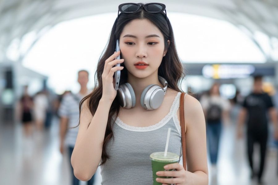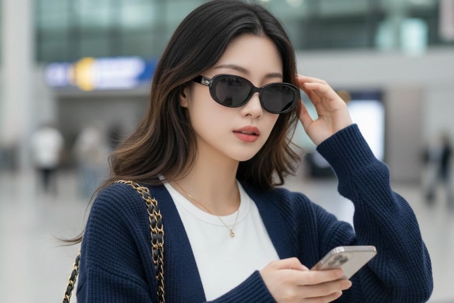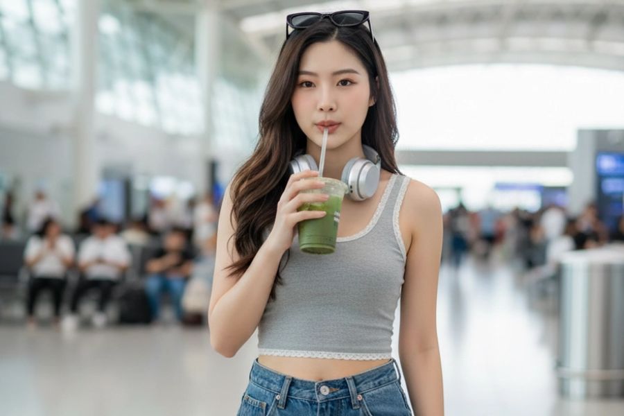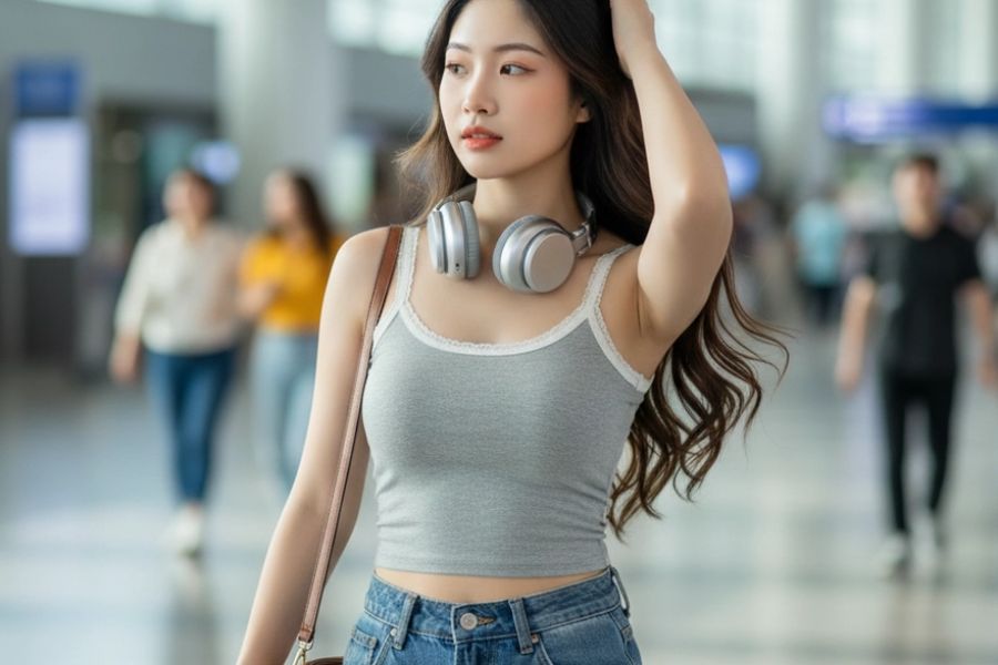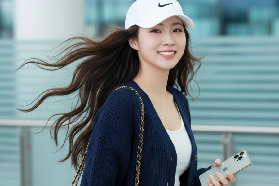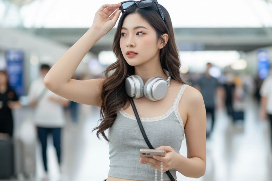 Trang phục đơn giản nhưng có form: Áo khoác, blazer, sơ mi, áo cổ lọ hoặc outfit tối màu, trung tính sẽ giúp AI dễ dựng vibe sân bay – đường phố cao cấp, hạn chế họa tiết rối mắt khiến ảnh trông kém sang.