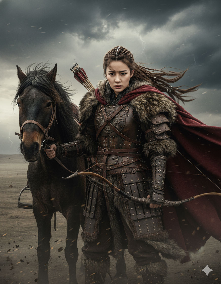 Tạo ảnh chân dung điện ảnh hoành tráng của nữ chiến binh Mông Cổ cổ đại. Nhân vật (giữ nguyên khuôn mặt) mặc giáp da viền lông, đeo cung sau lưng. Tóc tết chặt, ánh mắt sắc lạnh tự tin. Cô đứng cạnh ngựa giữa bầu trời giông gió, gió thổi bay áo choàng mạnh mẽ. Cảnh tượng sống động, hùng tráng như poster phim. Chất lượng 4K, chi tiết cực cao.