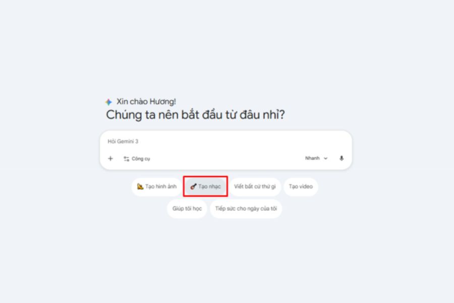 Sau khi đăng nhập thành công, giao diện trò chuyện quen thuộc của Gemini sẽ xuất hiện. Đây là nơi bạn có thể nhập yêu cầu, tạo nội dung hoặc sử dụng các công cụ AI tích hợp, bao gồm cả tính năng tạo nhạc bằng Lyria 3.