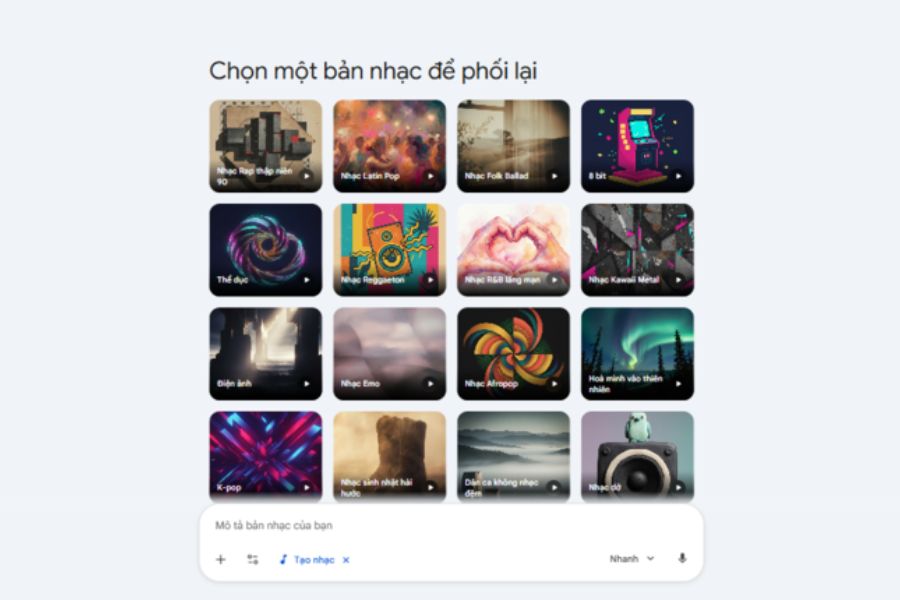 Để giúp bạn dễ hình dung hơn, dưới đây là một số ý tưởng mô tả có thể sử dụng khi tạo nhạc bằng Gemini: