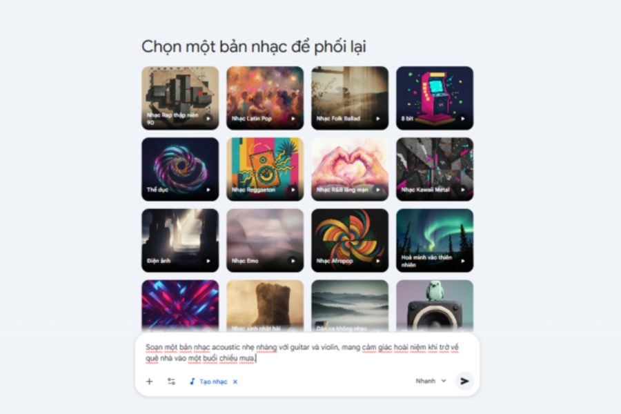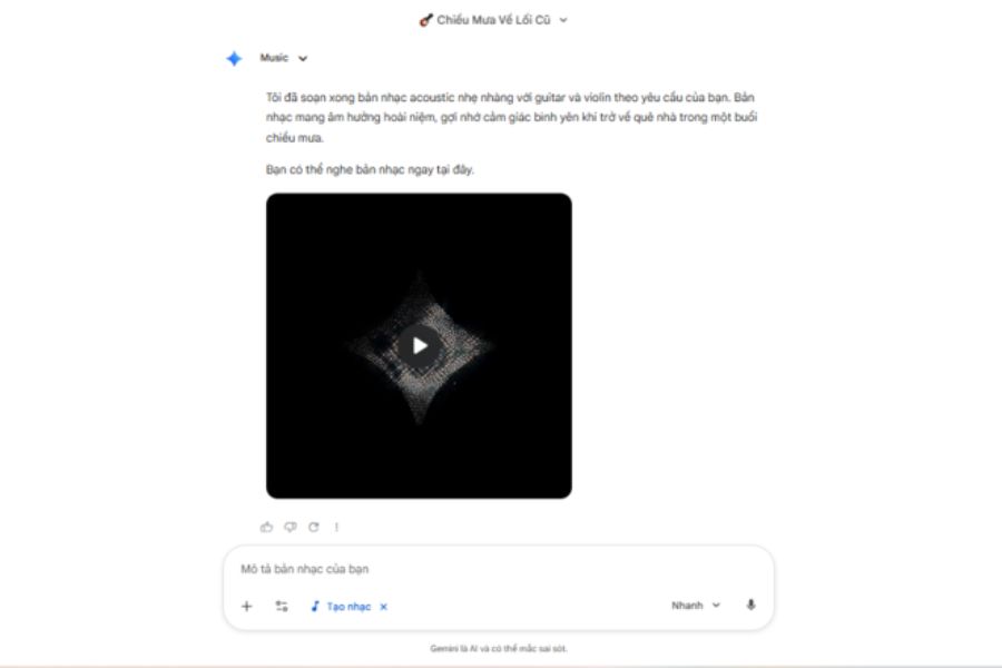 Ví dụ, bạn có thể nhập câu lệnh như: Soạn một bản nhạc acoustic nhẹ nhàng với guitar và violin, mang cảm giác hoài niệm khi trở về quê nhà vào một buổi chiều mưa. Từ mô tả này, Gemini sẽ hiểu được phong cách âm nhạc, nhạc cụ và cảm xúc mà bạn muốn truyền tải.