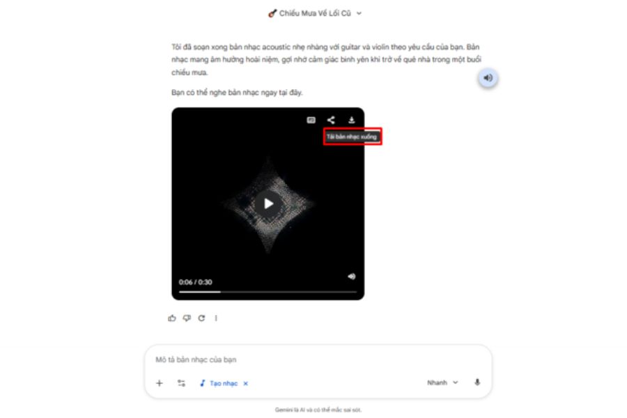 Sau khi Gemini tạo xong bản nhạc, phần trình phát sẽ hiển thị ngay trong giao diện trò chuyện. Tại đây bạn có thể nghe thử bản nhạc trước khi quyết định tải về. Nếu cảm thấy bản nhạc phù hợp với mục đích sử dụng, bạn có thể tải xuống chỉ trong vài bước đơn giản.