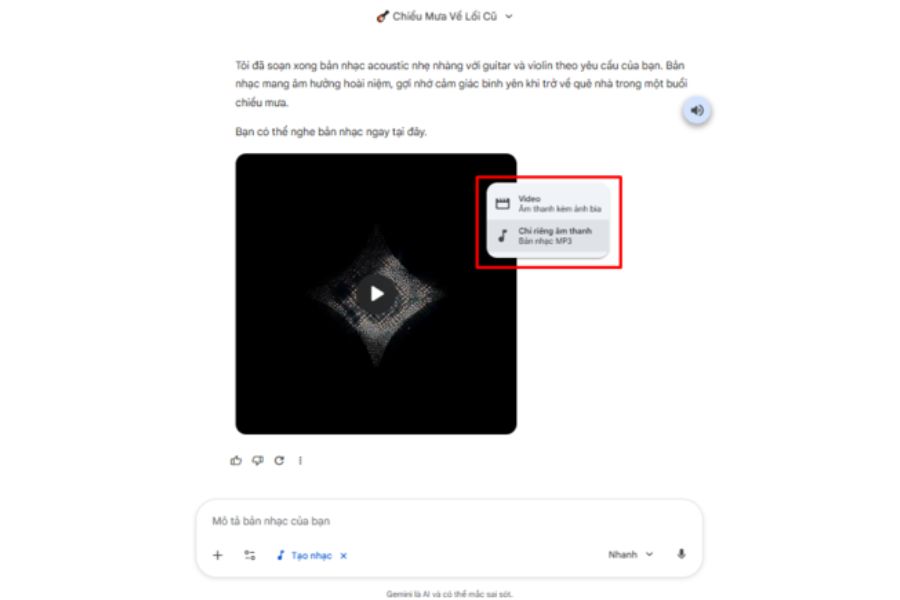 Nhạc được xuất dưới dạng video kèm ảnh bìa tùy chỉnh: Khi tạo nhạc, Gemini có thể tự động tạo ảnh bìa minh họa đi kèm và xuất bản nhạc dưới dạng video hoàn chỉnh. Điều này giúp người dùng có thể đăng tải trực tiếp lên các nền tảng như YouTube, TikTok hoặc Facebook mà không cần thiết kế thêm hình ảnh.