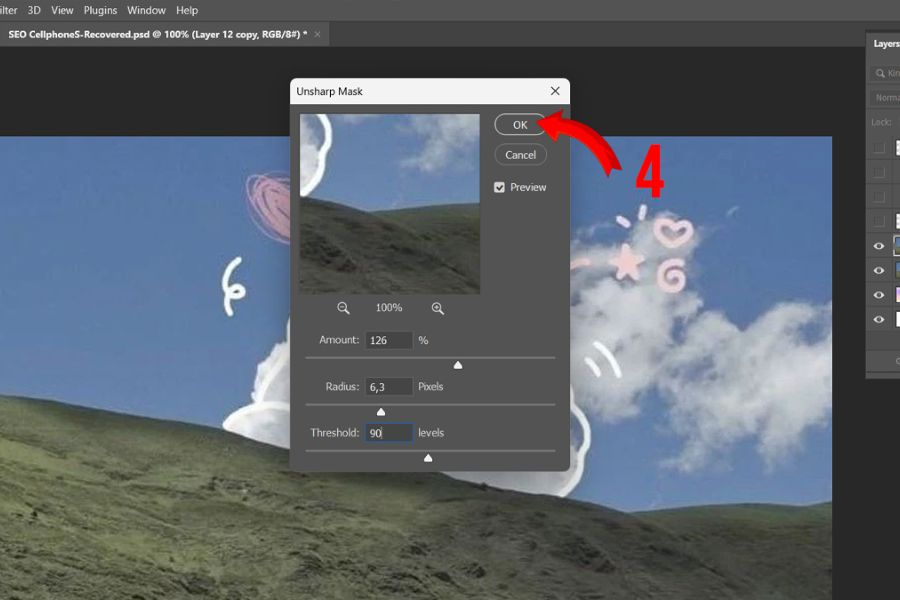 Bạn hãy điều chỉnh các thanh trượt một cách từ từ, quan sát tổng thể bức ảnh để đảm bảo độ nét vừa đủ, không bị gắt hay lộ nhiễu. Khi đã hài lòng với kết quả, bạn nhấn OK để áp dụng và hoàn tất quá trình chỉnh sửa.