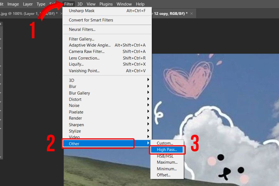 Trước tiên, bạn mở ảnh cần chỉnh sửa trong Photoshop, sau đó nhấn Ctrl + J để nhân đôi layer ảnh gốc. Việc tạo layer mới giúp bạn dễ dàng điều chỉnh mức độ làm nét hoặc hoàn tác khi cần. Tiếp theo, tại layer vừa nhân đôi, bạn vào menu Filter > Other > High Pass để bắt đầu quá trình làm nét bằng High Pass Filter.