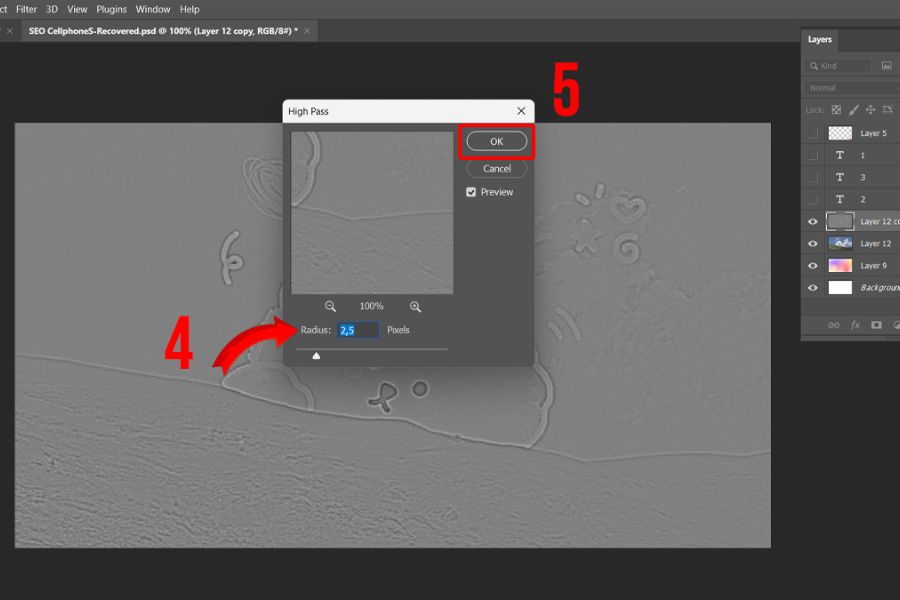 Khi hộp thoại High Pass xuất hiện, bạn tiến hành điều chỉnh thông số Radius. Thông thường, mức Radius từ 1 đến 3 pixel là phù hợp cho hầu hết các bức ảnh. Bạn hãy tăng dần Radius cho đến khi nhìn thấy rõ các chi tiết cần làm nét, trong khi tổng thể ảnh vẫn giữ tông xám nhẹ. Tránh đặt Radius quá cao vì điều này có thể khiến ảnh bị gắt và mất tự nhiên. Sau khi đã chọn được mức Radius hợp lý, bạn nhấn OK để áp dụng.