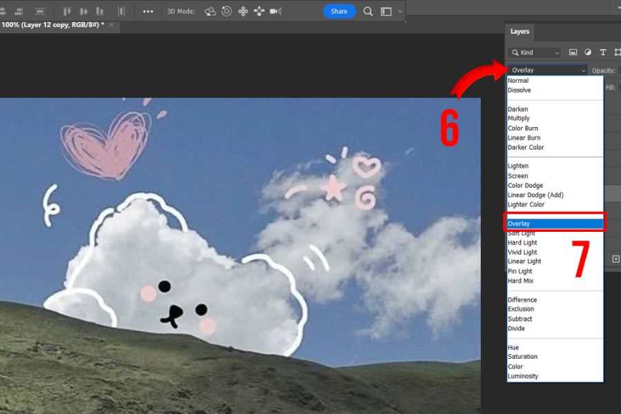 Sau khi áp dụng High Pass, ảnh sẽ hiển thị dưới dạng xám. Lúc này, bạn chuyển sang bảng Layer ở góc phải màn hình, nhấn vào biểu tượng mũi tên tại mục Blending Mode và chọn chế độ hòa trộn Overlay. Ngoài Overlay, bạn cũng có thể thử các chế độ khác như Soft Light (nhẹ hơn) hoặc Hard Light (mạnh hơn) để tìm ra hiệu ứng phù hợp nhất với bức ảnh. Nếu cảm thấy độ nét hơi gắt, hãy giảm Opacity của layer High Pass để ảnh trông tự nhiên và hài hòa hơn.