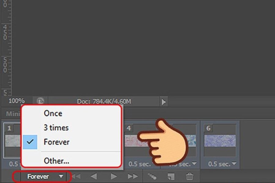 Để thiết lập số lần ảnh GIF lặp lại, bạn nhấn vào biểu tượng mũi tên ở phần Looping Options trên Timeline. Nếu bạn muốn ảnh động lặp liên tục, hãy chọn Forever để GIF chạy không ngừng.