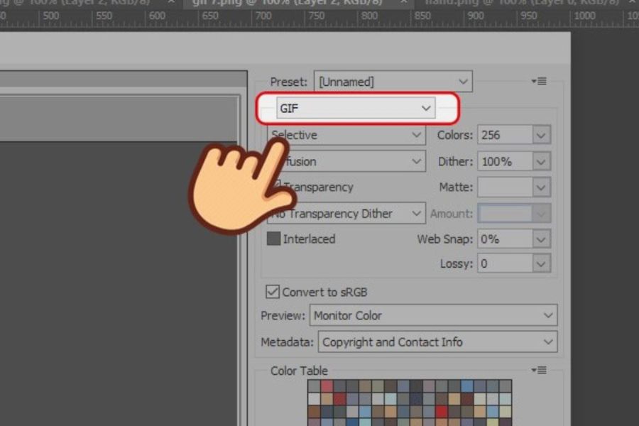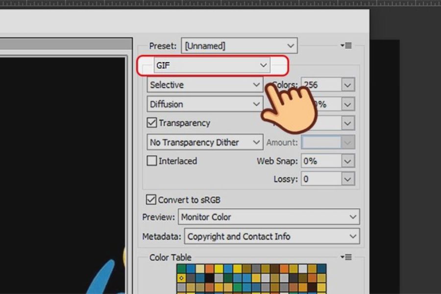 Trong cửa sổ Save for Web, bạn chọn định dạng GIF rồi tinh chỉnh thêm các tùy chọn như kích thước, số màu hoặc chế độ lặp nếu cần. Việc tinh chỉnh hợp lý sẽ giúp ảnh GIF hiển thị mượt mà mà vẫn đảm bảo dung lượng nhẹ.