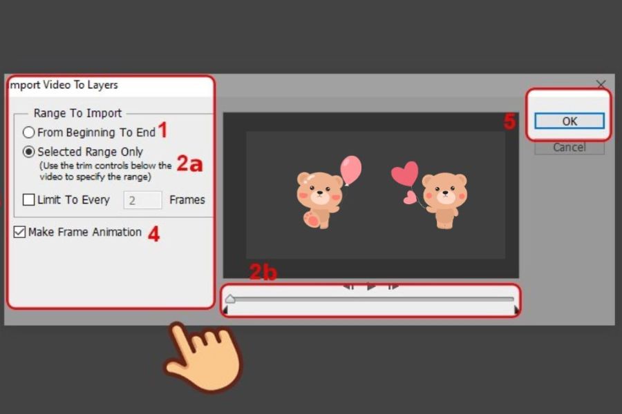 Sau khi thiết lập xong, bạn tích chọn Make Frame Animation rồi nhấn OK. Photoshop sẽ tự động tạo các frame tương ứng trên Timeline.