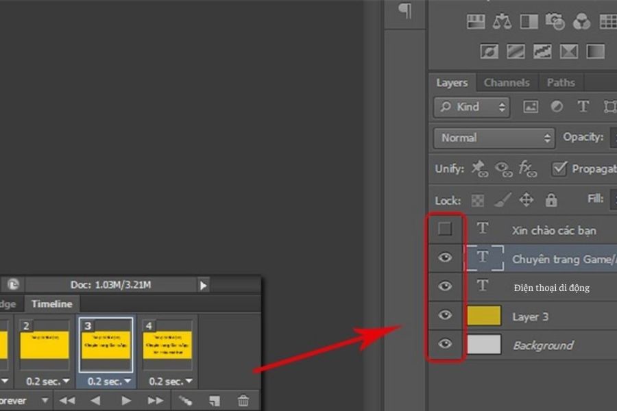 Ở bước này, bạn sẽ tạo chuyển động cho ảnh GIF bằng cách bật hoặc tắt biểu tượng con mắt của các layer tương ứng với từng frame. Mỗi frame chỉ nên hiển thị layer mà bạn muốn xuất hiện ở thời điểm đó, các layer còn lại cần được ẩn đi để tránh chồng hình.