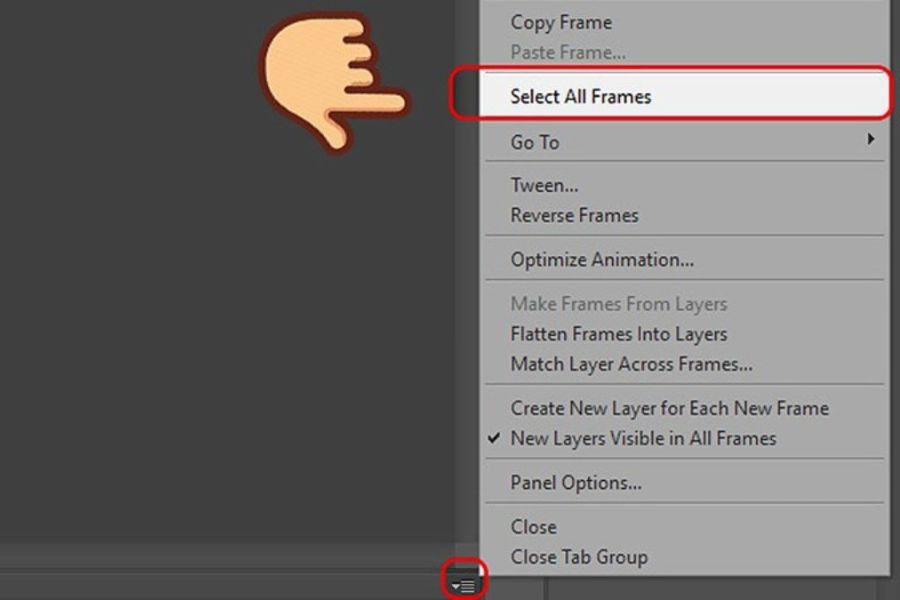 Để thiết lập thời gian hiển thị đồng đều cho các khung hình, bạn mở menu Animation/Timeline và chọn Select All Frames. Việc chọn toàn bộ frame giúp bạn chỉnh thời gian nhanh chóng mà không cần thao tác từng khung hình riêng lẻ.