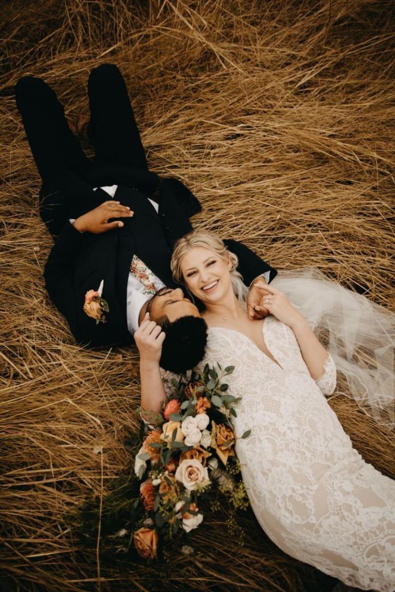 Khi chụp dáng nằm, góc chụp từ trên cao thường được sử dụng để tạo bố cục hài hòa. Cô dâu và chú rể có thể nằm cạnh nhau, nhìn vào mắt nhau hoặc trao nhau nụ hôn “ngược” đầy sáng tạo. Những khung hình này thường mang tính nghệ thuật cao, thể hiện sự gắn kết sâu sắc và cảm xúc mãnh liệt của hai người.