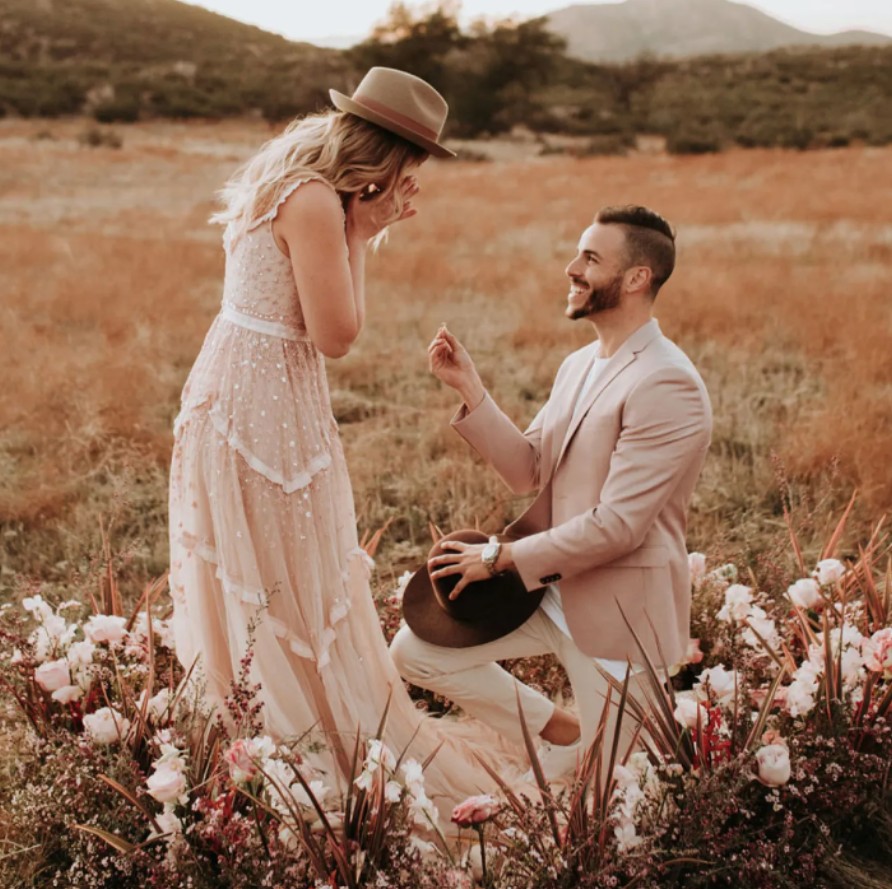 Tư thế cầu hôn là dáng pose kinh điển, gợi nhớ đến khoảnh khắc quan trọng khi hai người quyết định gắn bó trọn đời. Chú rể quỳ một chân, nắm tay cô dâu, ánh mắt hướng lên đầy chân thành.