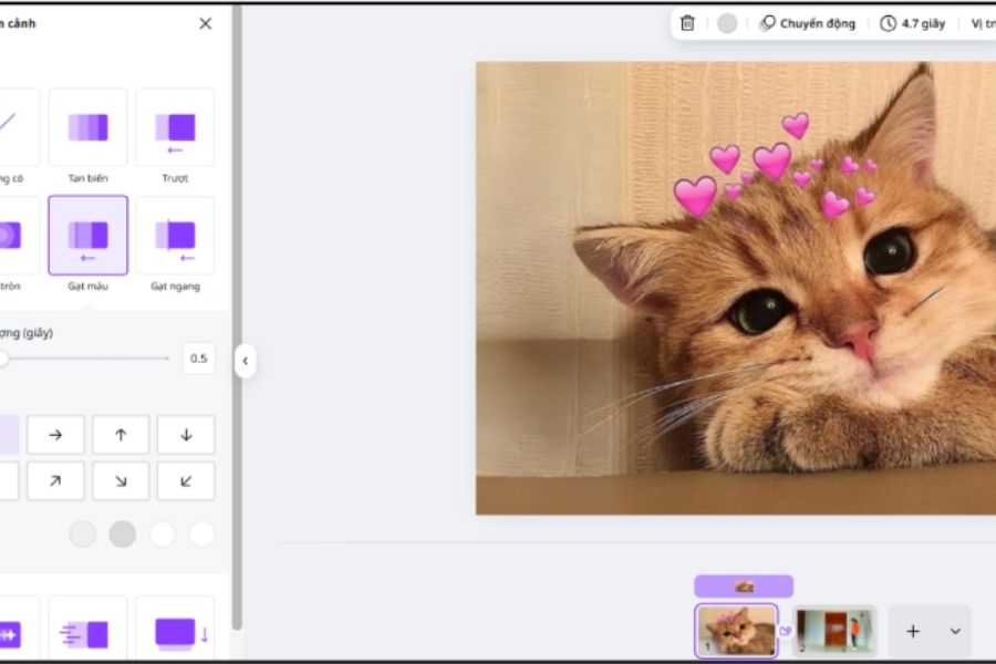 Di chuột vào ranh giới giữa hai trang; khi biểu tượng Thêm chuyển cảnh xuất hiện, click để mở danh sách hiệu ứng và chọn Morph (hoặc tên tương ứng trong Canva). Xem trước từng kiểu chuyển cảnh, điều chỉnh hướng hoặc chế độ nếu Canva cung cấp tuỳ chọn để tìm ra hiệu ứng phù hợp nhất với nội dung của bạn.