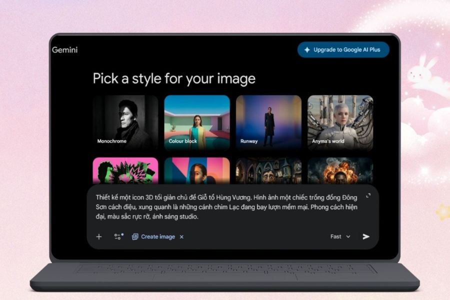 Gemini là nền tảng AI đa năng đang ngày càng được ưa chuộng nhờ khả năng tạo ảnh thông minh và linh hoạt. Điểm mạnh của công cụ này nằm ở việc hiểu prompt rất chính xác, kể cả khi bạn mô tả chi tiết về bố cục, màu sắc hay phong cách. Điều này giúp quá trình tạo icon trở nên nhanh chóng và ít phải chỉnh sửa lại nhiều lần.