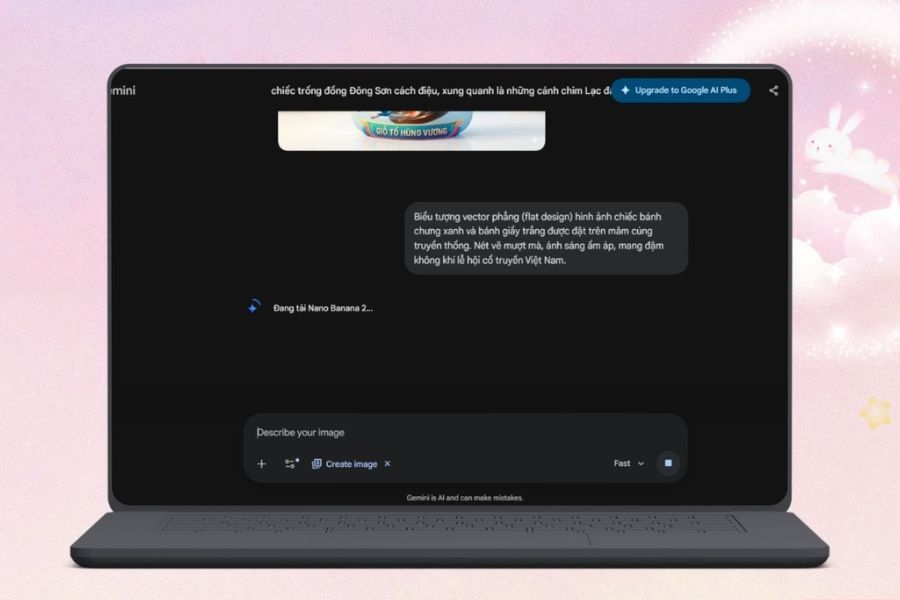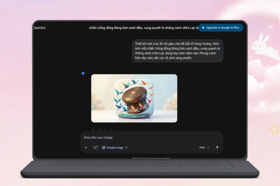 Sau khi đã sẵn sàng, hãy tìm đến mục tạo ảnh (thường là “Create image” hoặc “Generate”). Tại đây, bạn cần nhập câu lệnh mô tả – yếu tố quyết định trực tiếp đến chất lượng icon. Một prompt tốt nên bao gồm chủ thể chính (ví dụ: đền Hùng, trống đồng), phong cách (truyền thống, tối giản, hiện đại) và màu sắc chủ đạo (đỏ, vàng, pastel…). Càng mô tả rõ ràng, AI càng dễ tạo ra hình ảnh đúng với mong muốn.