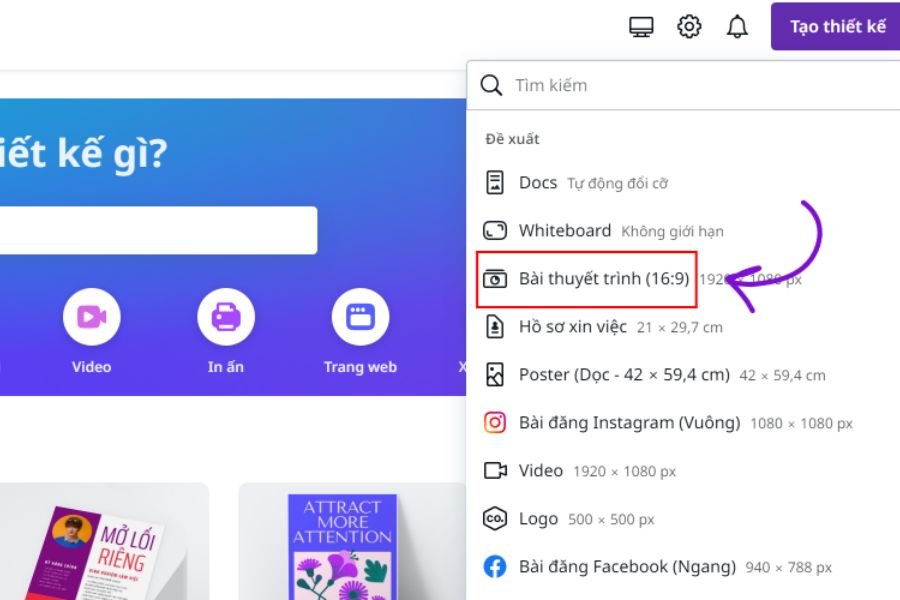 Tại trang chính, nhấn nút Tạo thiết kế rồi chọn Bài thuyết trình 16:9 để có kích thước slide phù hợp với hầu hết màn hình và máy chiếu. Bạn cũng có thể chọn kích thước tùy chỉnh nếu cần định dạng khác cho thiết bị di động hoặc tài liệu in. Sau khi chọn, một bản trình bày mới sẽ mở ra để bạn bắt đầu.