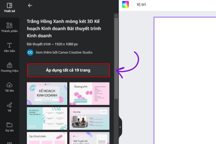 Duyệt qua kho mẫu có sẵn hoặc dùng thanh tìm kiếm để lọc theo chủ đề, ví dụ giáo dục, kinh doanh hoặc công nghệ. Khi thấy mẫu ưng ý, bạn có thể click để xem toàn bộ slide trong bộ mẫu và chọn Áp dụng tất cả nếu muốn dùng nguyên layout đó cho toàn bộ bài giảng.