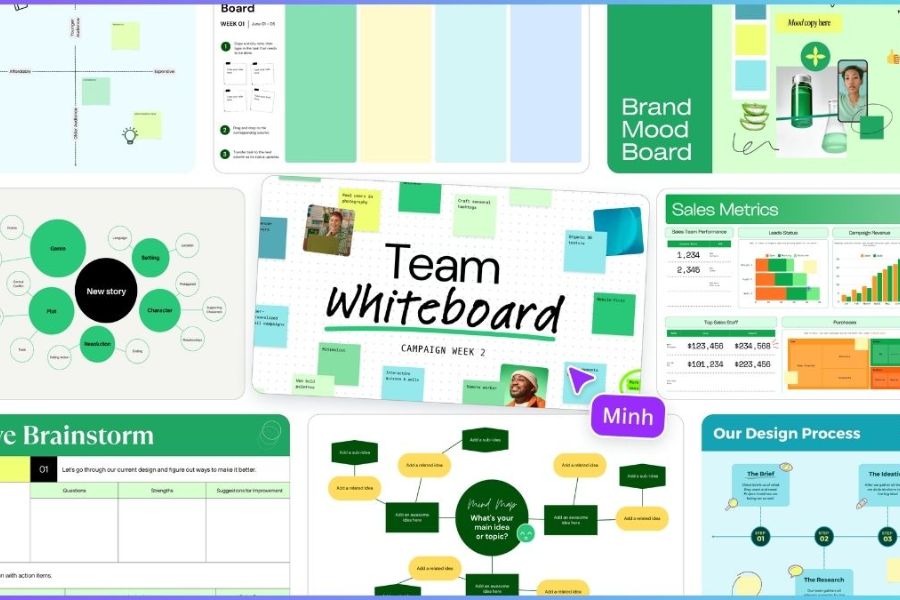 Một trong những điểm mạnh của Canva Whiteboard là kho mẫu có sẵn cực kỳ đa dạng, phù hợp cho nhiều mục đích khác nhau như sơ đồ tư duy, kế hoạch marketing, quy trình làm việc hay quản lý dự án. Người dùng chỉ cần chọn mẫu phù hợp và chỉnh sửa theo nhu cầu, không mất thời gian thiết kế từ đầu.