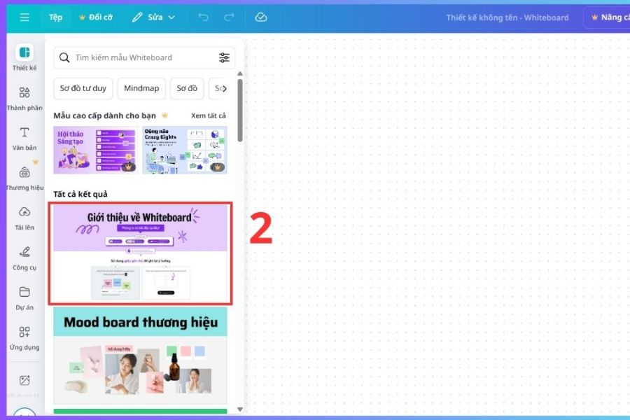 Sau khi mở Canva Whiteboard, bạn có thể chọn một mẫu có sẵn hoặc tạo một bảng trắng hoàn toàn mới. Canva cung cấp nhiều template được thiết kế sẵn cho brainstorm, sơ đồ tư duy, lập kế hoạch marketing hay quản lý dự án, giúp bạn không phải bắt đầu từ con số 0.
