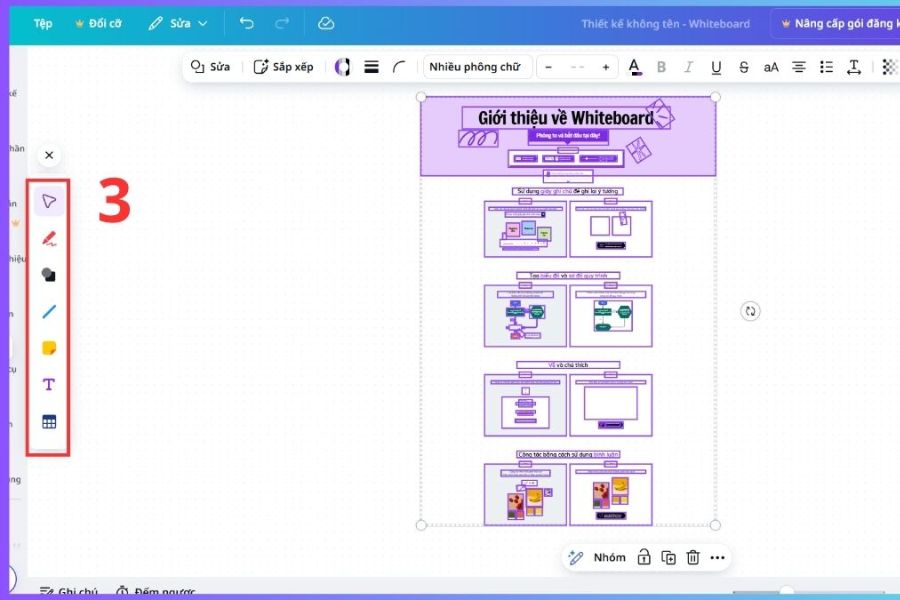 Điểm cộng lớn của Canva Whiteboard là ngay cả khi sử dụng bản miễn phí, người dùng vẫn có thể trải nghiệm đầy đủ các tính năng cơ bản như bút vẽ, sticky note, chèn ảnh, icon và các mẫu bố cục có sẵn. Không cần nâng cấp tài khoản hay kỹ năng thiết kế chuyên sâu, bạn vẫn có thể sáng tạo tùy thích và chia sẻ ý tưởng một cách chuyên nghiệp, linh hoạt trong môi trường số hiện đại.