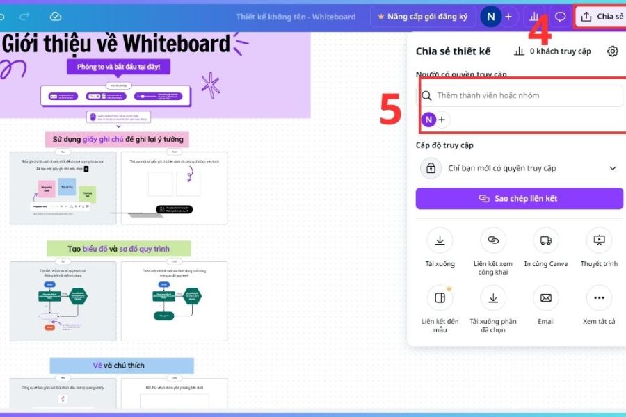 Canva Whiteboard hỗ trợ cộng tác thời gian thực, cho phép nhiều người cùng làm việc trên một bảng. Bạn chỉ cần nhấn nút “Share”, sau đó thêm email của đồng nghiệp, bạn học hoặc tạo liên kết chia sẻ quyền truy cập.