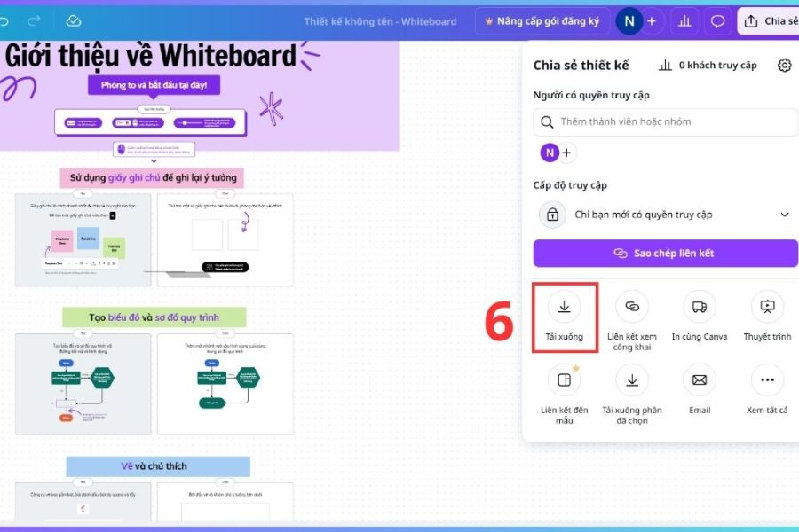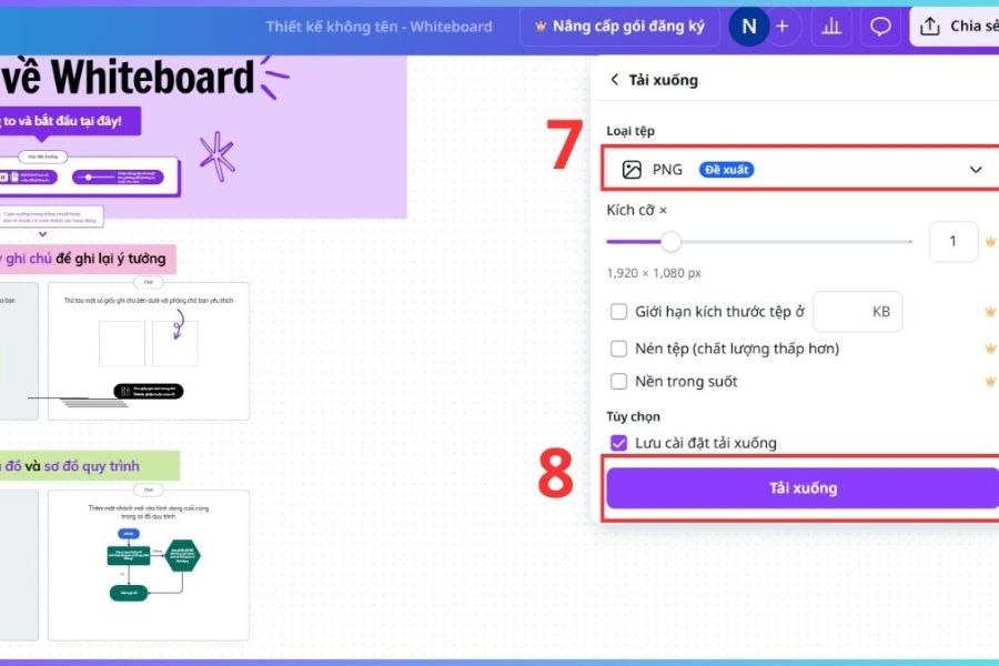 Sau khi hoàn thiện nội dung, bạn nhấn “Tải xuống” để lưu bảng trắng về thiết bị. Canva cho phép xuất file dưới nhiều định dạng phổ biến như PNG, JPG hoặc PDF, phù hợp cho việc lưu trữ, trình chiếu hoặc chia sẻ lại cho người khác.