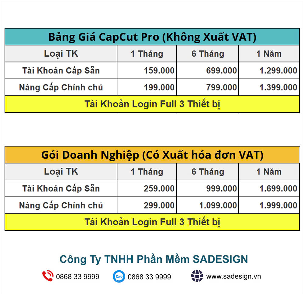 SaDesign, hay Công ty TNHH SADESIGN, là một trong những nhà cung cấp phần mềm đồ họa hàng đầu tại Việt Nam. Với nhiều năm kinh nghiệm trong ngành, SaDesign không chỉ cung cấp các sản phẩm Capcut mà còn nhiều phần mềm phổ biến khác như Photoshop bản quyền, Canva Pro, Zoom Pro, Google One, Chatgpt... Được đăng ký kinh doanh sản xuất hóa đơn đỏ VAT đầy đủ, SaDesign cam kết cung cấp sản phẩm chính hãng với đầy đủ hóa chất đơn từ và giấy phép, đảm bảo quyền lợi cho người sử dụng.