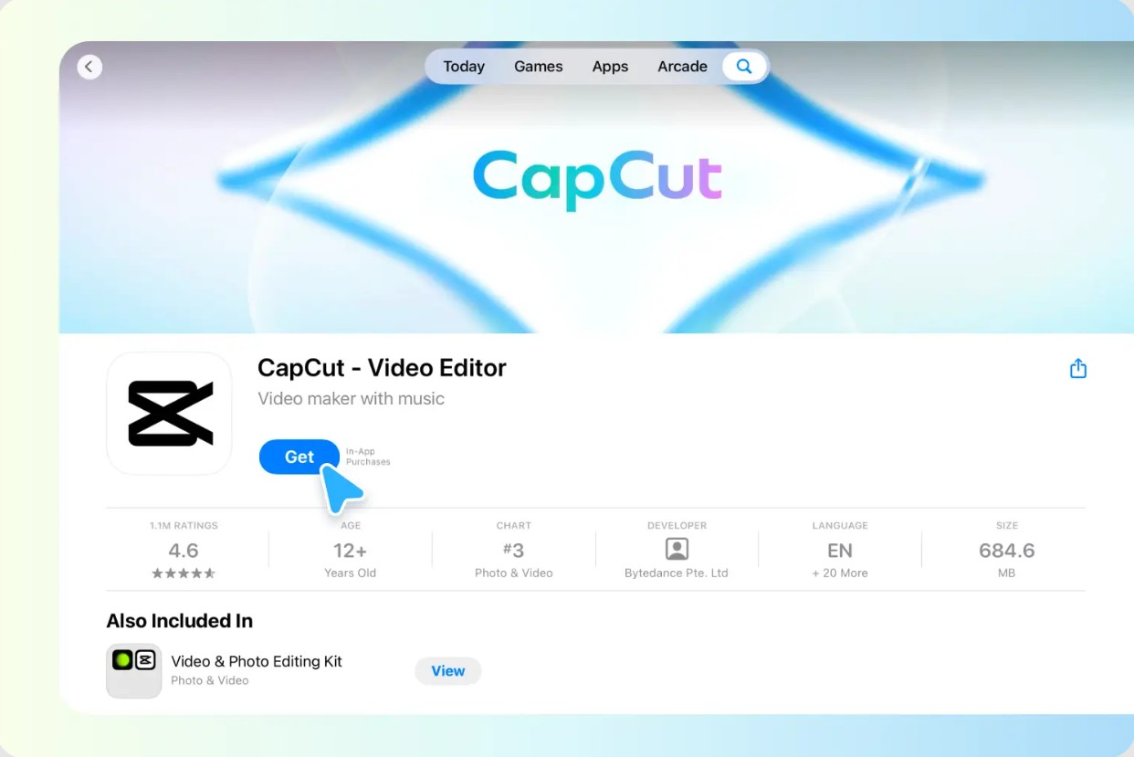 Để bắt đầu sử dụng CapCut trên iPad, bạn chỉ cần nhấp vào nút tải xuống được cung cấp hoặc mở trực tiếp App Store trên thiết bị của mình. Trong thanh tìm kiếm, nhập từ khóa “CapCut” và nhấn nút “Tải xuống”. Quá trình này diễn ra nhanh chóng và đơn giản, phù hợp với mọi đối tượng người dùng.