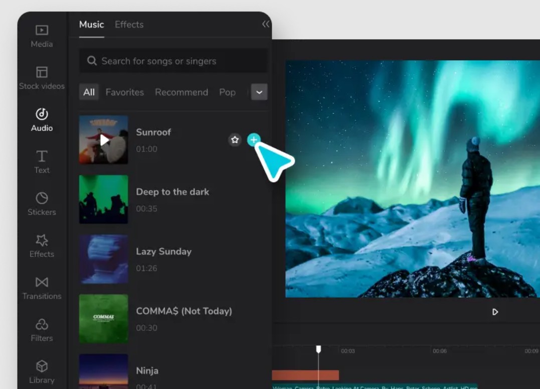 Việc thêm âm thanh và hiệu ứng vào dòng thời gian rất đơn giản. Bạn chỉ cần chọn hiệu ứng mong muốn từ bảng điều khiển bên trái, sau đó nhấp vào dấu “+” để thêm chúng vào video. Các hiệu ứng của CapCut được thiết kế hiện đại, phù hợp với nhiều phong cách nội dung khác nhau, từ quảng cáo sản phẩm cho đến video truyền thông nội bộ.