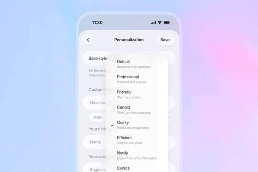 Khả năng tùy chỉnh tính cách được xem là một trong những điểm nhấn quan trọng của ChatGPT 5.1. OpenAI cung cấp nhiều preset như Default, Friendly, Professional, Efficient, Candid, Nerdy hay Cynical, giúp người dùng định hình phong cách tương tác theo mong muốn. Điều này đặc biệt hữu ích cho doanh nghiệp và người sáng tạo nội dung, khi họ cần đồng bộ giọng văn hoặc xây dựng trải nghiệm phù hợp với nhóm đối tượng cụ thể.