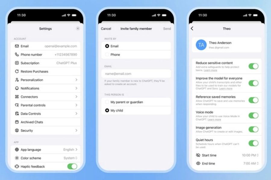 Để bắt đầu sử dụng tính năng kiểm soát của phụ huynh trên ChatGPT, bạn cần chuẩn bị hai tài khoản riêng biệt một cho cha mẹ và một cho con. Sau đó, truy cập vào mục “Settings” → “Parental Controls” → “Add Child” và gửi lời mời kết nối. Khi con chấp nhận, hệ thống sẽ tự động kích hoạt chế độ giám sát. Từ đây, phụ huynh có thể thiết lập quyền truy cập, giới hạn thời gian và các tùy chọn bảo mật chỉ trong vài phút. Toàn bộ quá trình được thiết kế trực quan, dễ sử dụng, phù hợp với cả những người ít am hiểu công nghệ.