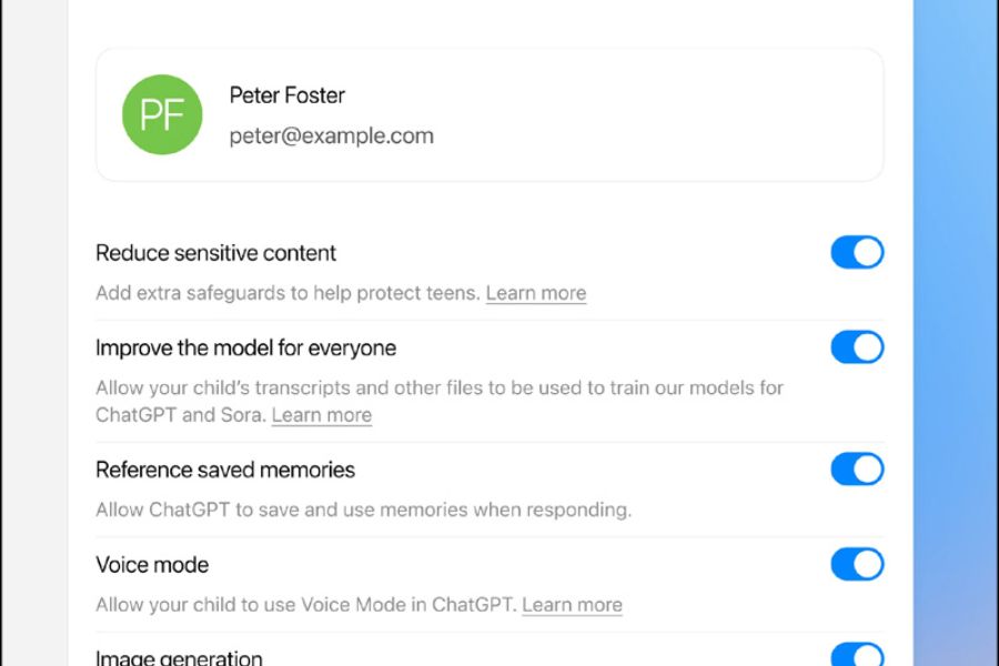 Ngoài ra, tính năng kiểm soát này còn cho phép tùy chỉnh nâng cao như tắt chế độ thoại (voice mode), vô hiệu hóa bộ nhớ trò chuyện (memory), hay ngăn việc sử dụng dữ liệu để huấn luyện mô hình. Phụ huynh cũng có thể tắt khả năng tạo hình ảnh bằng DALL-E nhằm hạn chế tiếp xúc với nội dung hình ảnh không phù hợp. Toàn bộ các thiết lập đều được quản lý thông qua trung tâm điều khiển dành riêng cho phụ huynh, nơi OpenAI còn tích hợp hướng dẫn và lời khuyên từ các chuyên gia tâm lý giúp cha mẹ vừa bảo vệ, vừa đồng hành cùng con trong quá trình học hỏi và khám phá thế giới AI một cách an toàn.