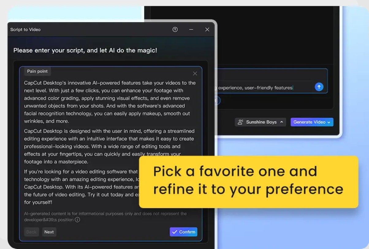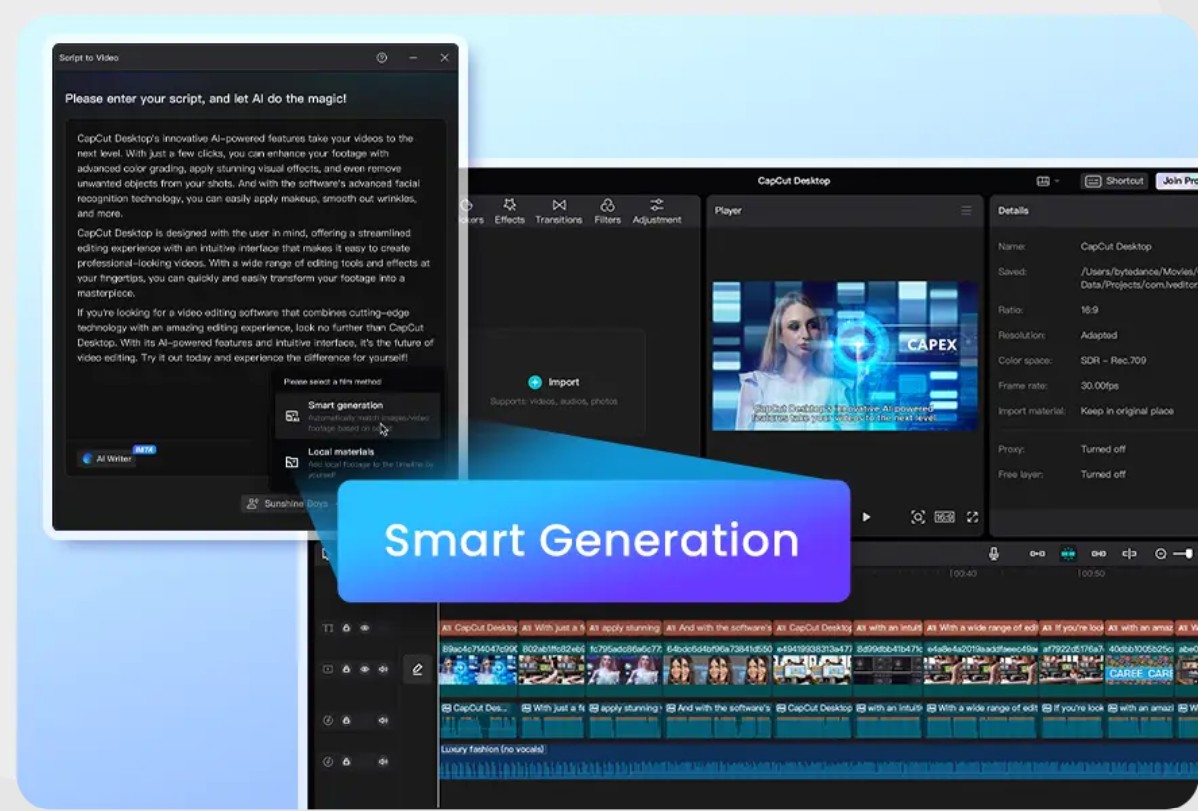 Chỉ với một thao tác chọn “Thế hệ thông minh”, CapCut Desktop sẽ tự động tạo video. Thành phẩm bao gồm hình ảnh, phụ đề, giọng đọc và nhạc nền được đồng bộ hóa.