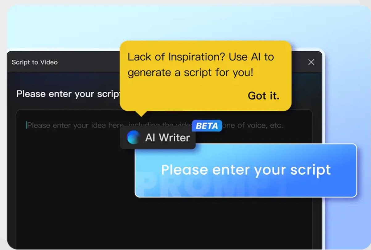 Người dùng bắt đầu bằng cách truy cập tính năng “Script to Video” và chọn “AI Writer”. Tại đây, bạn có thể nhập bất kỳ ý tưởng nào, từ nội dung giáo dục, câu chuyện cá nhân cho đến kịch bản quảng cáo.