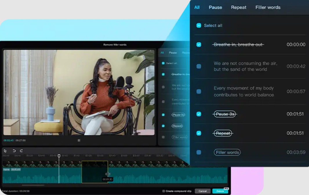Ngoài ra, AI còn hỗ trợ đồng bộ hóa lại nhịp nói sau khi cắt, tránh tình trạng video bị “giật” hoặc mất tự nhiên. Điều này đặc biệt quan trọng với các nội dung dài như podcast, nơi sự liền mạch đóng vai trò then chốt trong trải nghiệm người xem.
