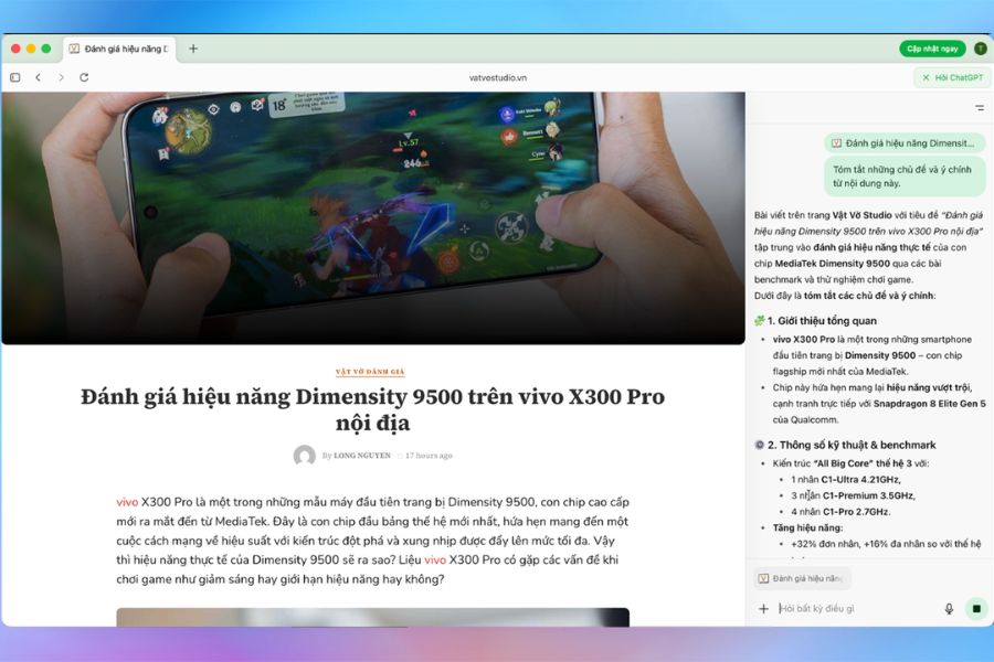 Ưu điểm của Sidebar ChatGPT là giúp người dùng tối ưu hóa thời gian và tăng khả năng hiểu sâu nội dung. Ví dụ, khi bạn đọc một bài báo dài về công nghệ, chỉ cần yêu cầu “Tóm tắt giúp tôi bài viết này trong 5 dòng”, Atlas sẽ ngay lập tức rút gọn thông tin chính xác và dễ hiểu. Tính năng này đặc biệt hữu ích cho sinh viên, nhà nghiên cứu hoặc bất kỳ ai cần xử lý lượng lớn thông tin trong thời gian ngắn. Với Chrome, bạn phải sao chép văn bản, mở ChatGPT ở tab khác rồi dán vào vừa tốn thời gian, vừa cắt rời mạch đọc.