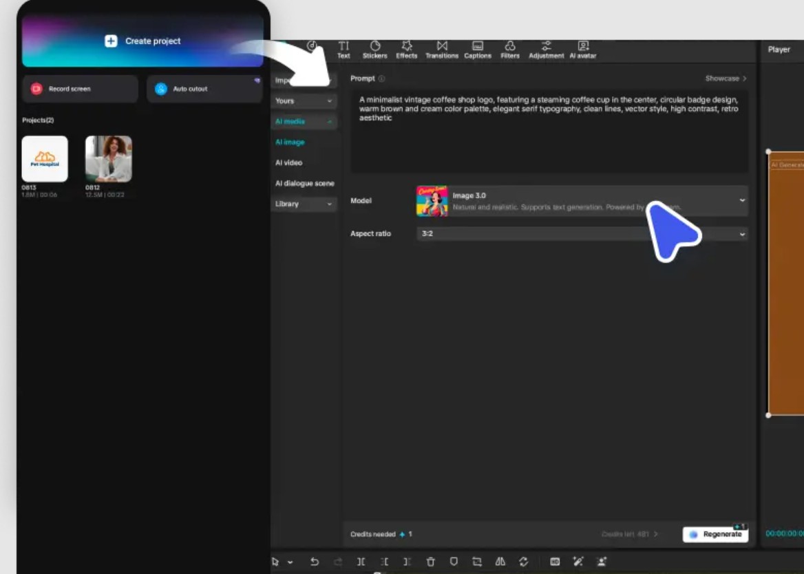Người dùng bắt đầu bằng cách tạo một dự án mới trong CapCut, sau đó điều hướng đến mục “AI media” và chọn “Text to image”. Tại đây, bạn nhập mô tả chi tiết về logo mong muốn, bao gồm phong cách, màu sắc, cảm xúc và lĩnh vực thương hiệu. Việc mô tả càng rõ ràng sẽ giúp AI tạo ra kết quả sát với mong đợi hơn.