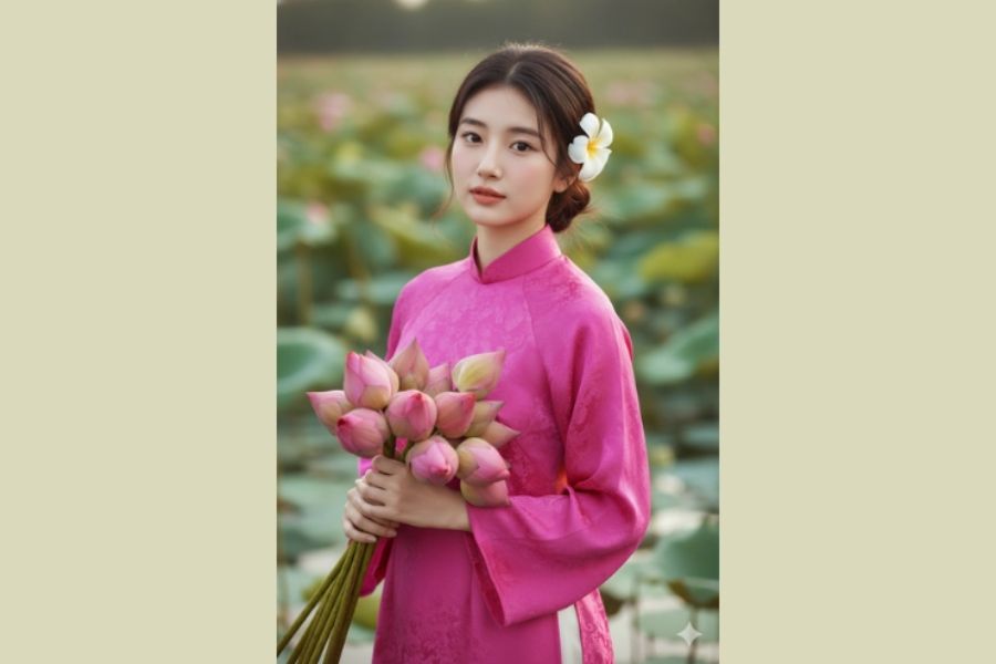 Giữ nguyên khuôn mặt 100% ảnh tham chiếu. Chân dung cận cảnh, phụ nữ Việt Nam da trắng sứ, makeup nhẹ: má hồng, môi hồng đào. Mái tóc búi thấp rối nhẹ, cài hoa trắng tinh khôi. Cô mặc áo dài hồng sen, vải gấm, tay áo loe nhẹ, cầm bó hoa sen lớn. Cảnh nền là hồ sen nhiều hoa và búp, ánh sáng tự nhiên dịu dàng như nắng sớm hoặc chiều tà. Tông màu ấm áp, hoài cổ, vintage, tạo không khí Tết truyền thống, tinh tế và nữ tính.